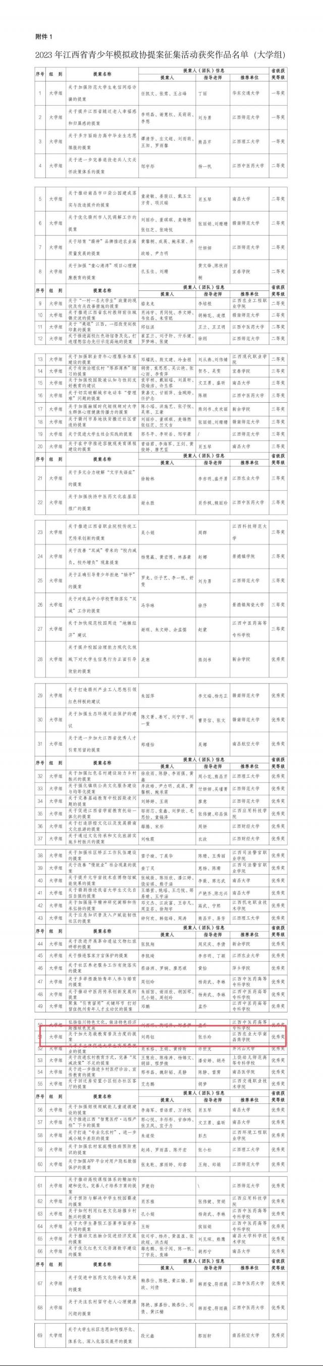 近日,共青团江西省委、政协江西省委员会提案委员会、江西省教育厅、江西省学生联合会联合开展2023年江西省模拟政协提案征集活动。经自主申请、高校初审、单位作品推荐、省级资格复查、评审会综合评审和团省委书记办公会研究等环节,评选出一等奖作品5件、二等奖作品15件、三等奖作品20件、优秀奖作品60件。