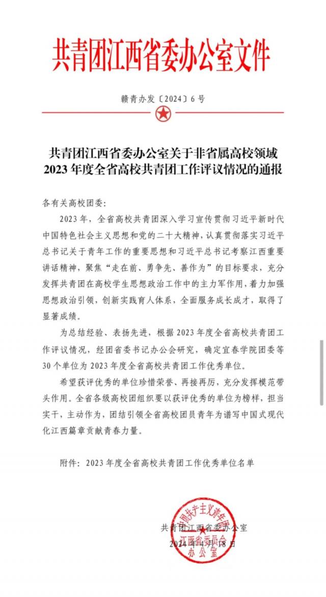 2023年,全省高校共青团积极深入学习和广泛宣传习近平新时代中国特色社会主义思想以及党的二十大精神,坚决贯彻习近平总书记关于青年工作的重要指示以及考察江西时的讲话精神,紧盯“走在前、勇争先、善作为”的奋斗目标,充分发挥在高校学生思想政治工作中的核心作用,不断强化思想政治的引领作用,同时创新实践育人机制,全方位助力青年学生成长成才,取得了令人瞩目的成绩。经团省委书记办公会研究,我院荣获2023年度全省高校共青团工作优秀单位。