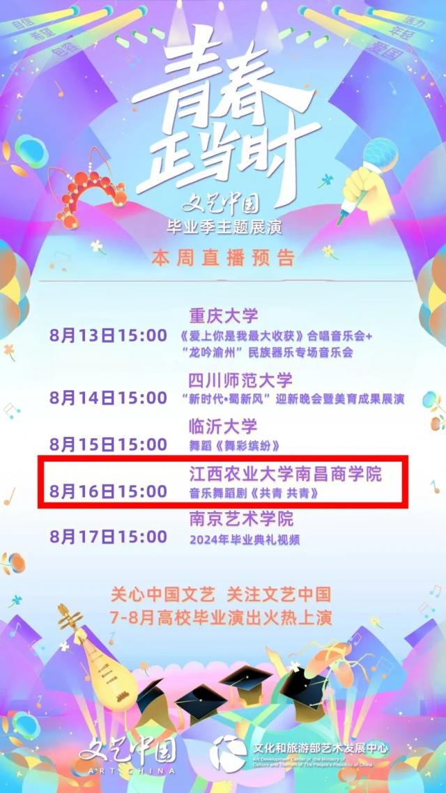 8月16日,学院倾力制作的原创音乐舞蹈剧《共青共青》荣登首届“青春正当时”文艺中国毕业季主题展演暨全国高校美育成果展示活动。此次展演由文化和旅游部艺术司指导,文化和旅游部艺术发展中心主办,在文艺中国、央视网、人民日报、新华网、光明网等多家媒体联动线上展播。