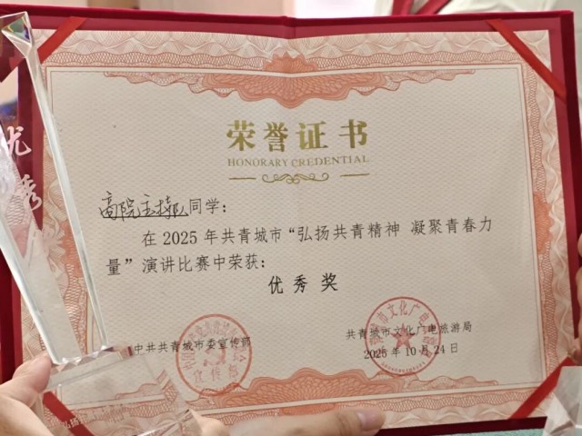 恰逢共青城市垦荒创业70周年,由中共共青城市委宣传部、共青城市文化广电旅游局联合主办的“弘扬共青精神 凝聚青春力量”演讲比赛于10月24日在南昌应用技术师范学院圆满落幕。我校李梓烨同学和商院主持队不负众望,在激烈角逐中凭借扎实的功底与真挚的情感脱颖而出,分别斩获二等奖和优秀奖,为校争光!